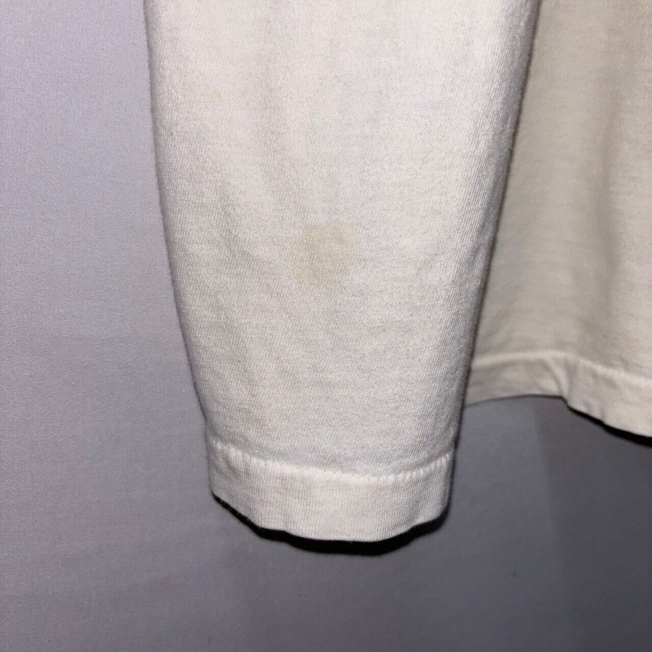 ボール型のグラフィックとストライプで形成されたデザインは、90年代の大学Tやチーム系Tシャツを彷彿とさせます。