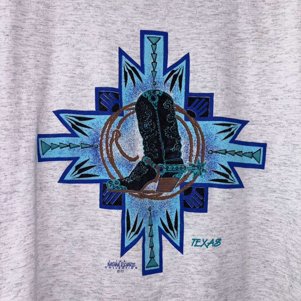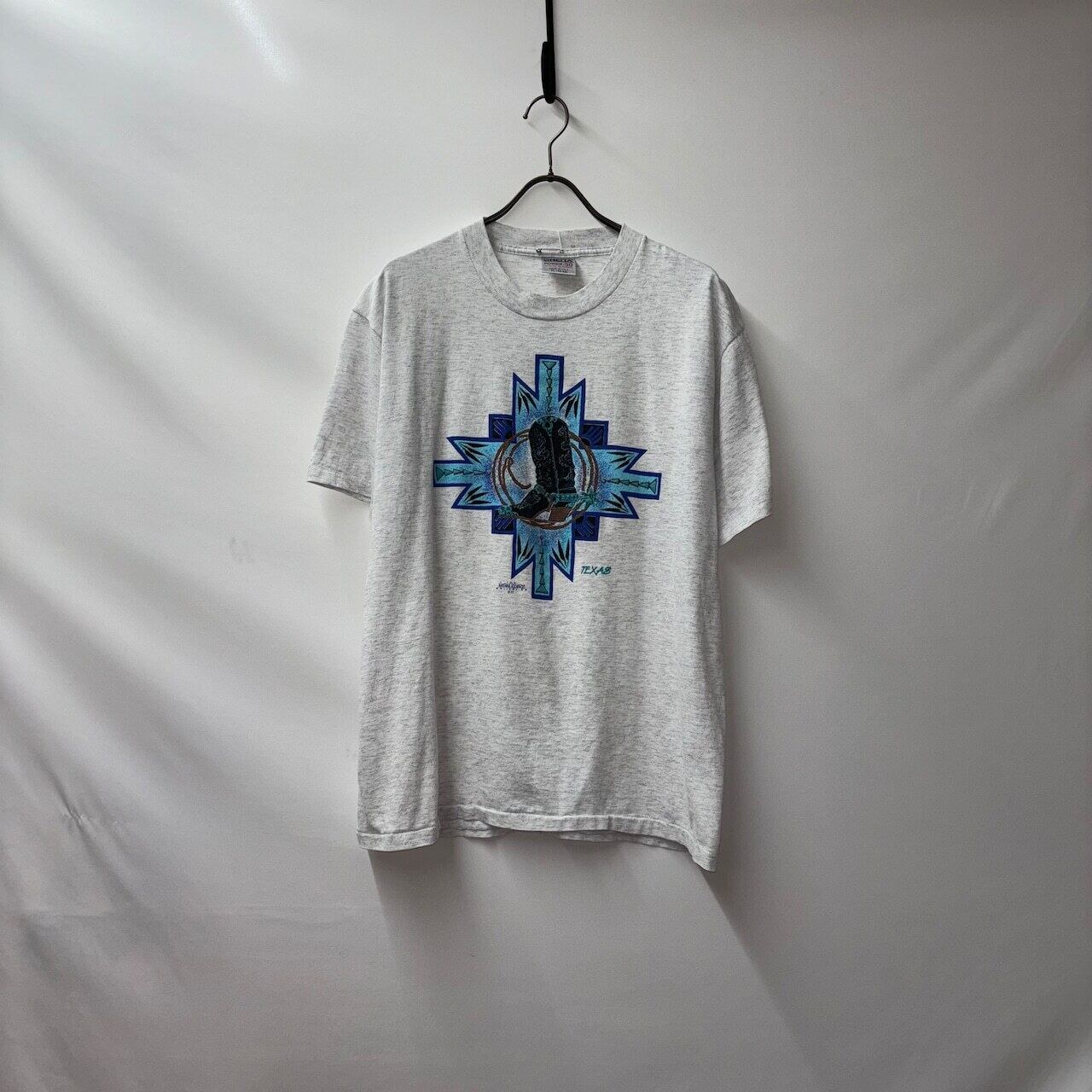 テキサス州を象徴するような、ウエスタンブーツとロープのグラフィックが印象的な90年代のTシャツ。