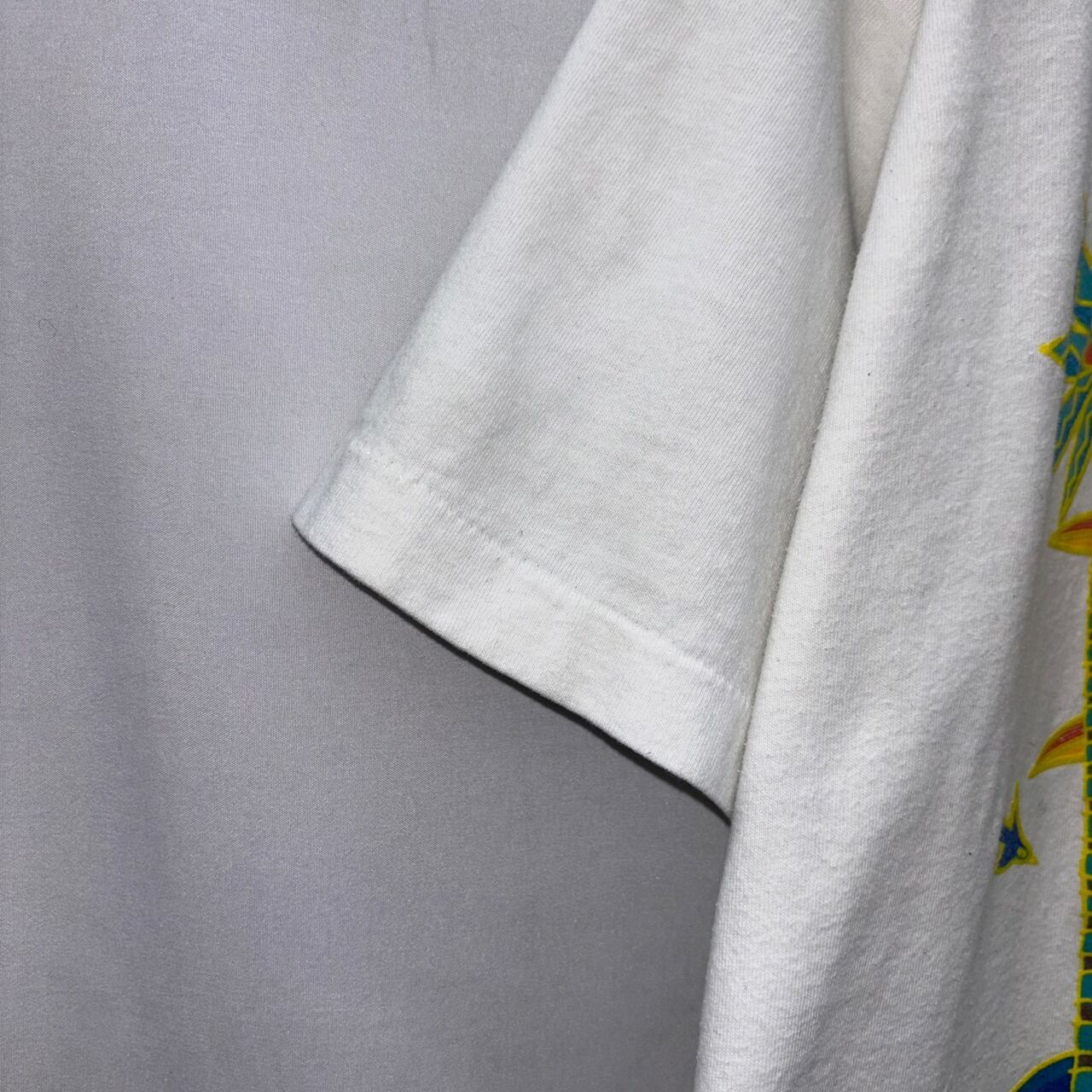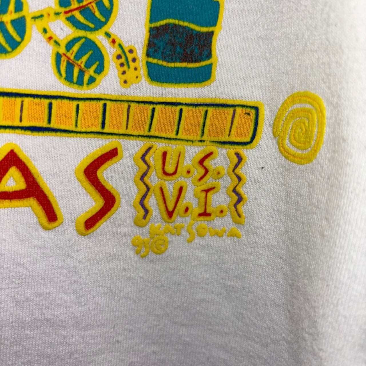 "ST.THOMAS" のロゴと南国モチーフの組み合わせが、90年代らしいアート感を演出しています。