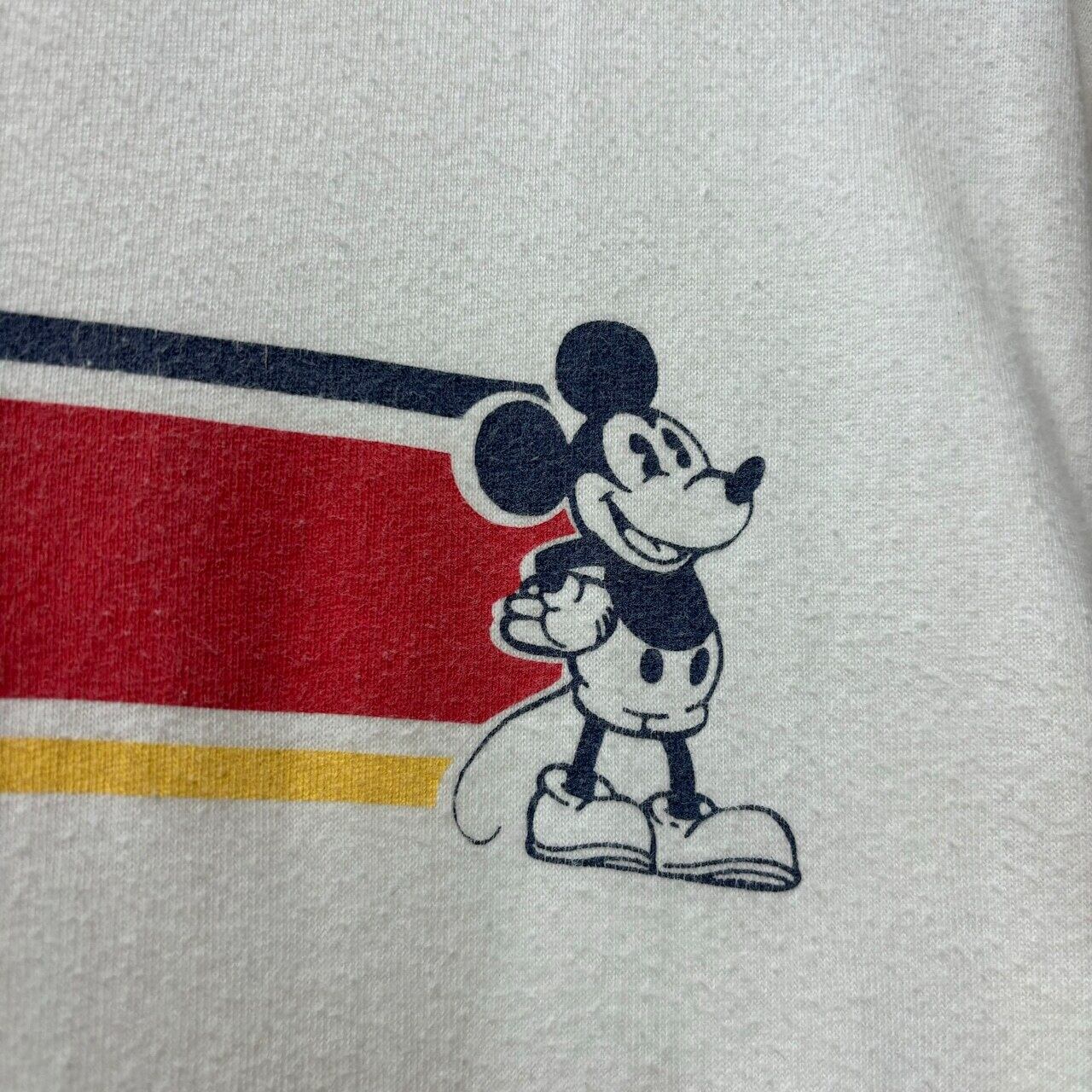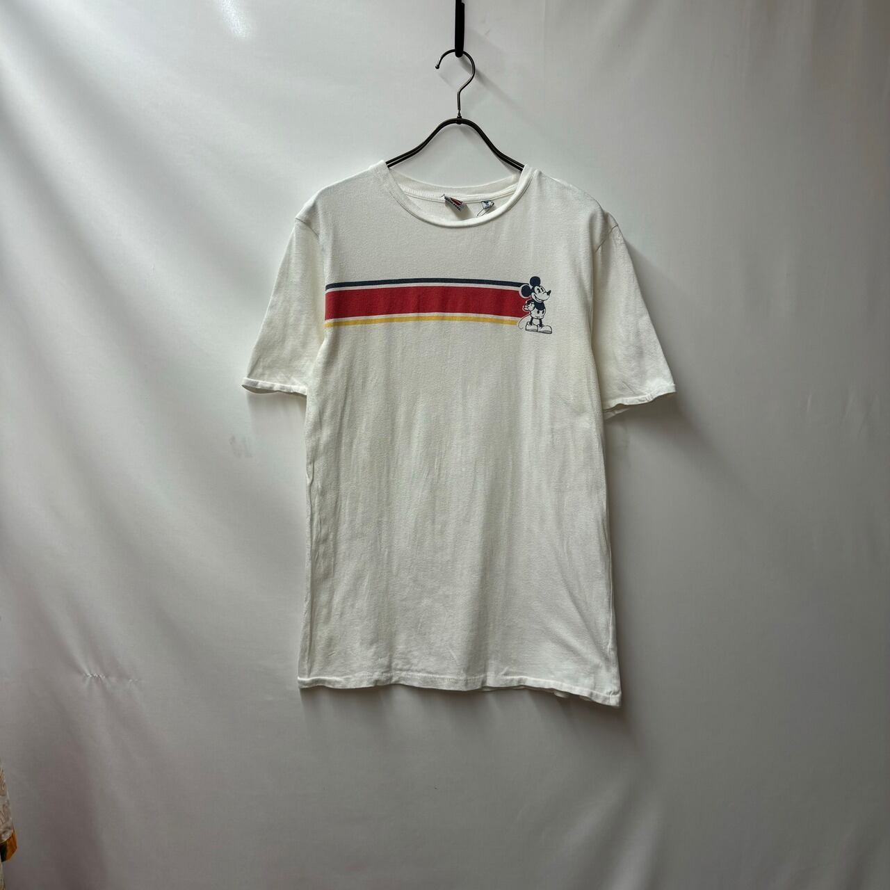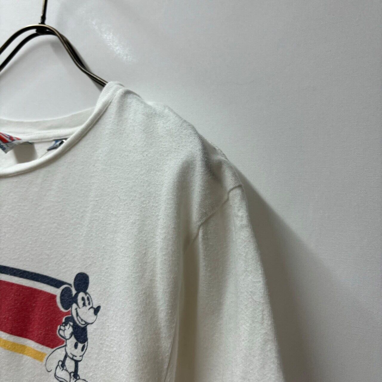 ヴィンテージ風のミッキーマウスが胸元にプリントされた一着。赤・紺・イエローのラインにキャラクターが自然に馴染むデザインで、レトロでありながら今のスタイルにもフィットします。