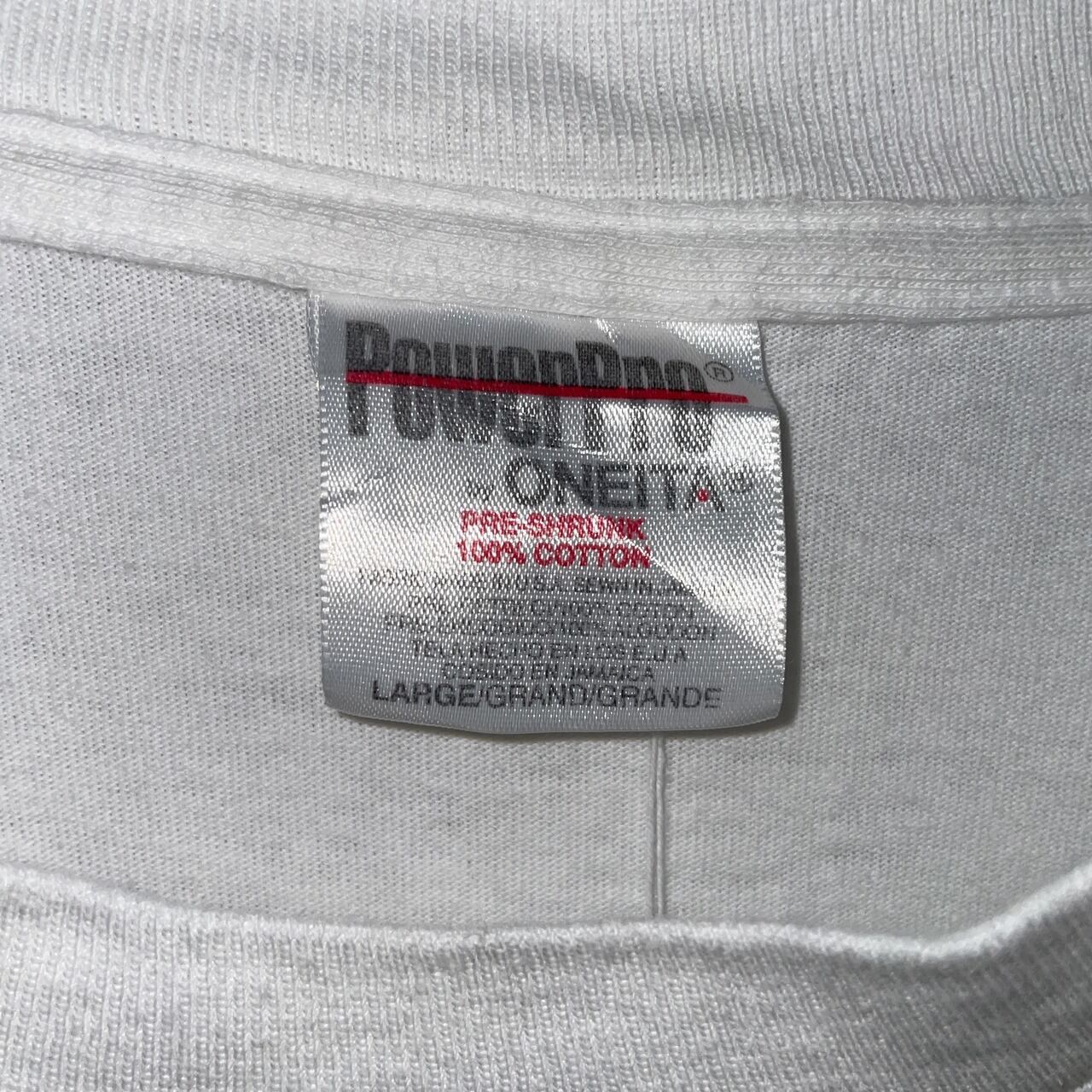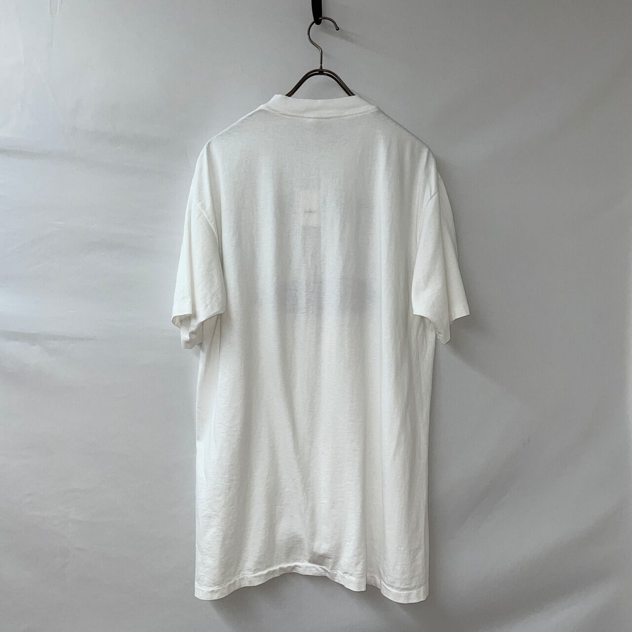 白ボディにブルー・レッド・イエローのカラーリングが映え、90年代らしいフォントデザインも魅力の一着です。