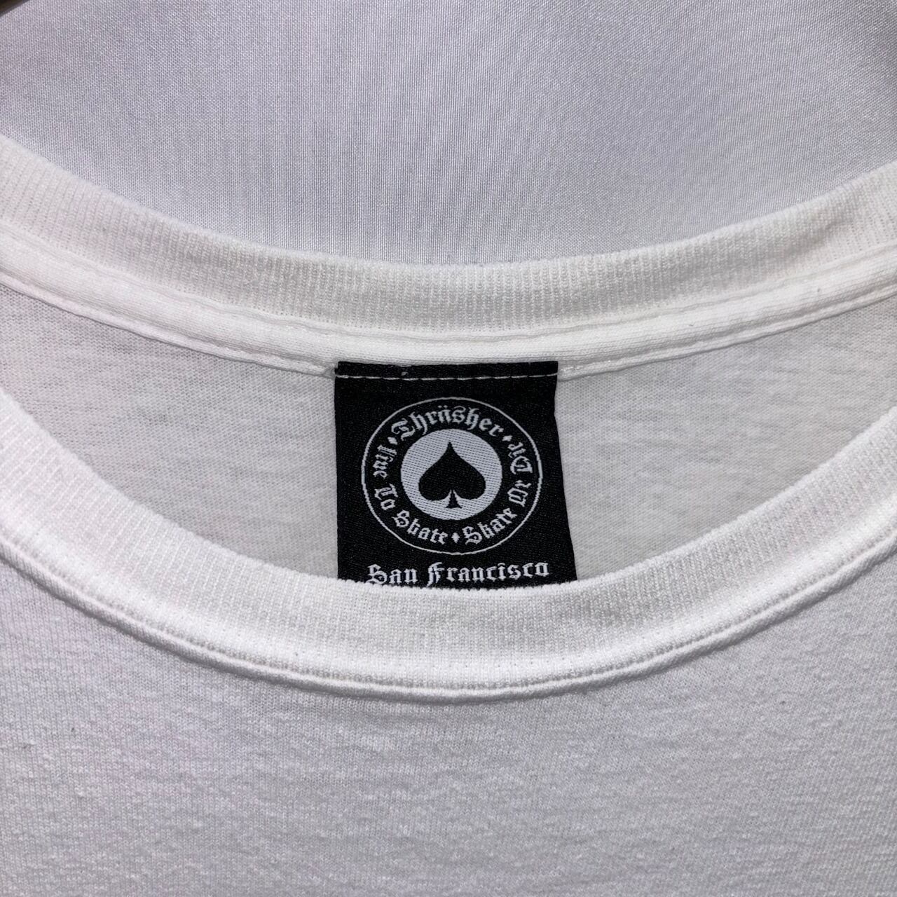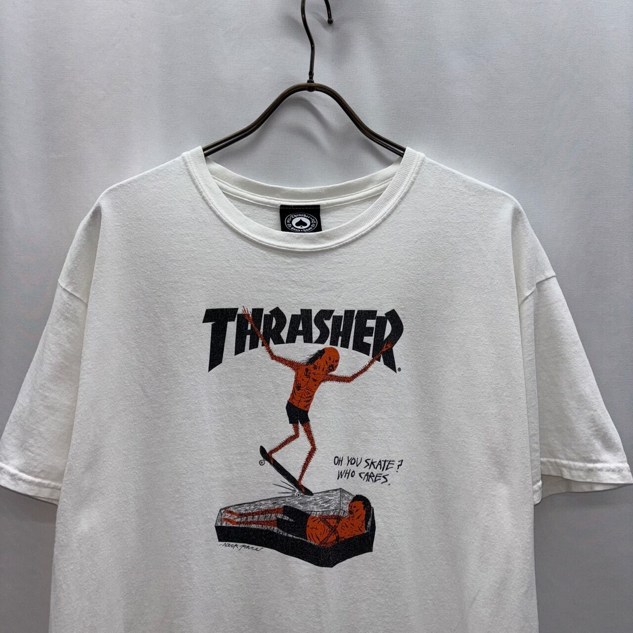 フロントに大きく「THRASHER」ロゴを配置し、その下には棺桶の上でスケートボードをする人物が描かれたユーモラスなグラフィック。