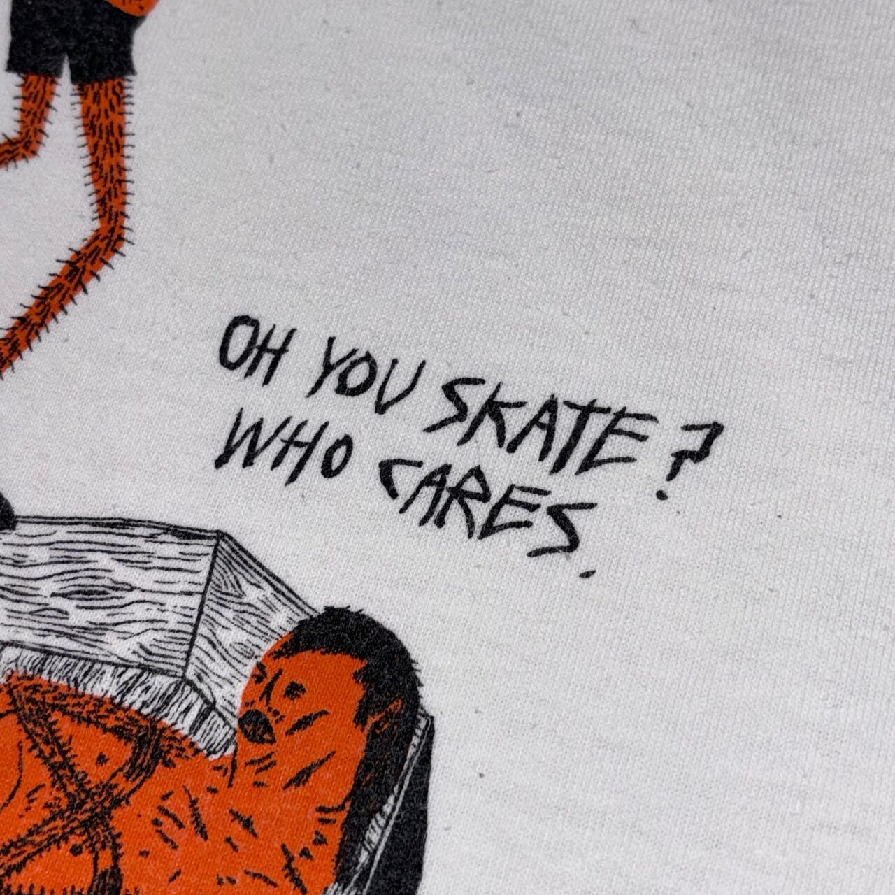 その横には「OH YOU SKATE? WHO CARES.(あんたスケートするの? だから何?)」という皮肉めいたフレーズが添えられています。