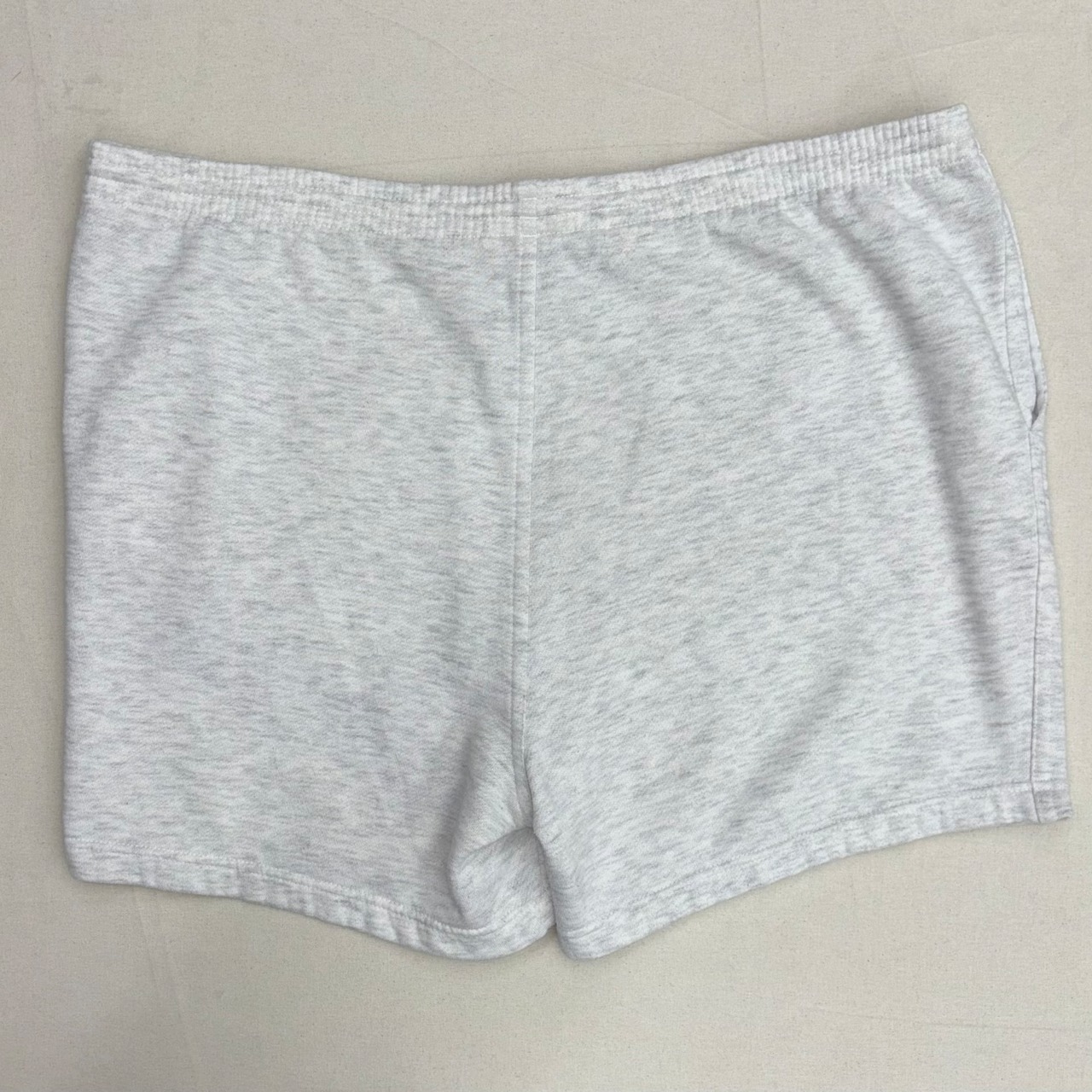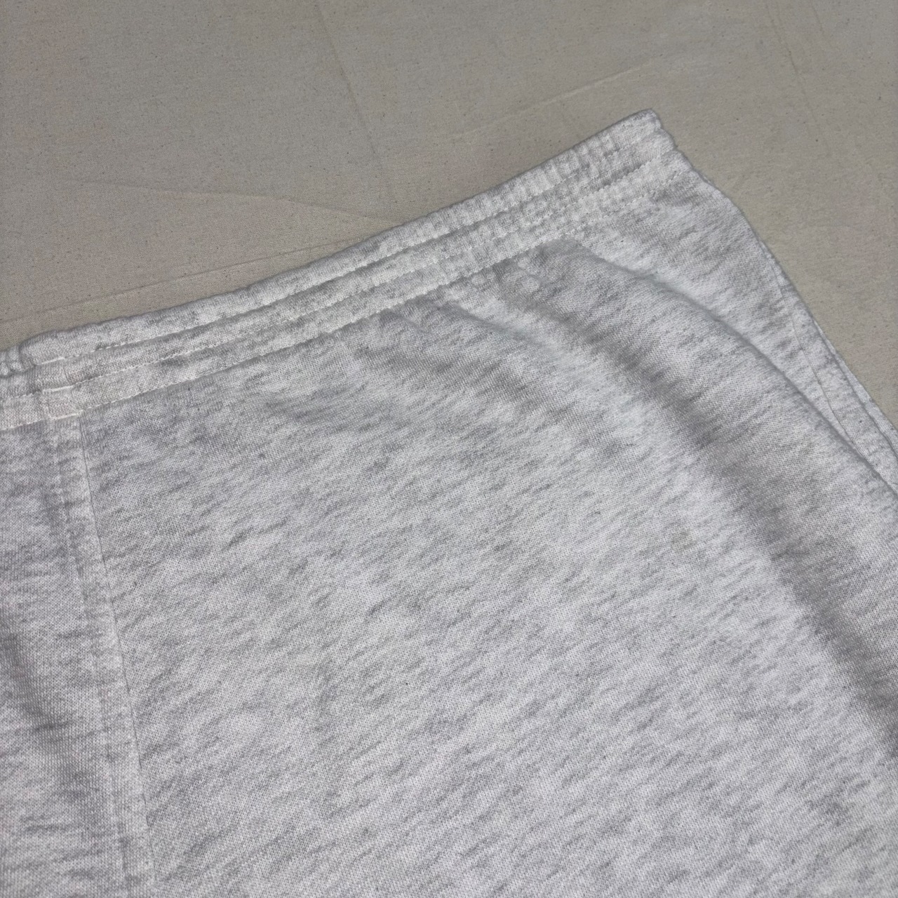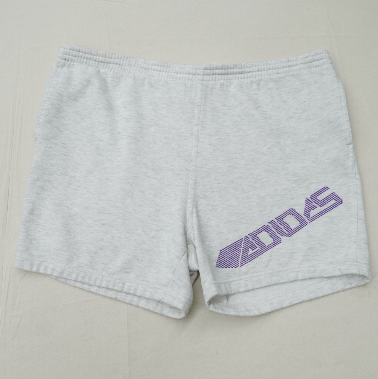 ライトグレーのボディにパープルの「adidas」ロゴがアクセントになったショートパンツ。