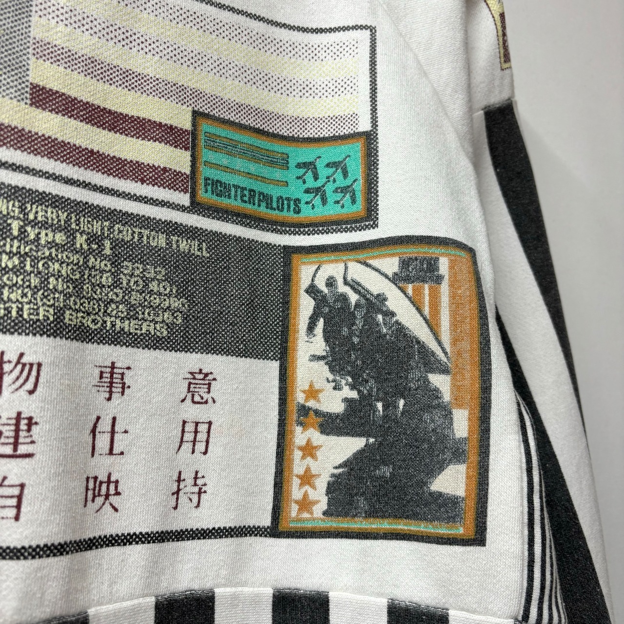 フロント全体にアメリカ国旗や兵士のシルエット、航空モチーフや漢字を組み合わせた独特の総柄デザイン。