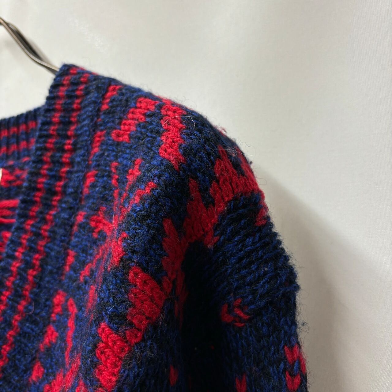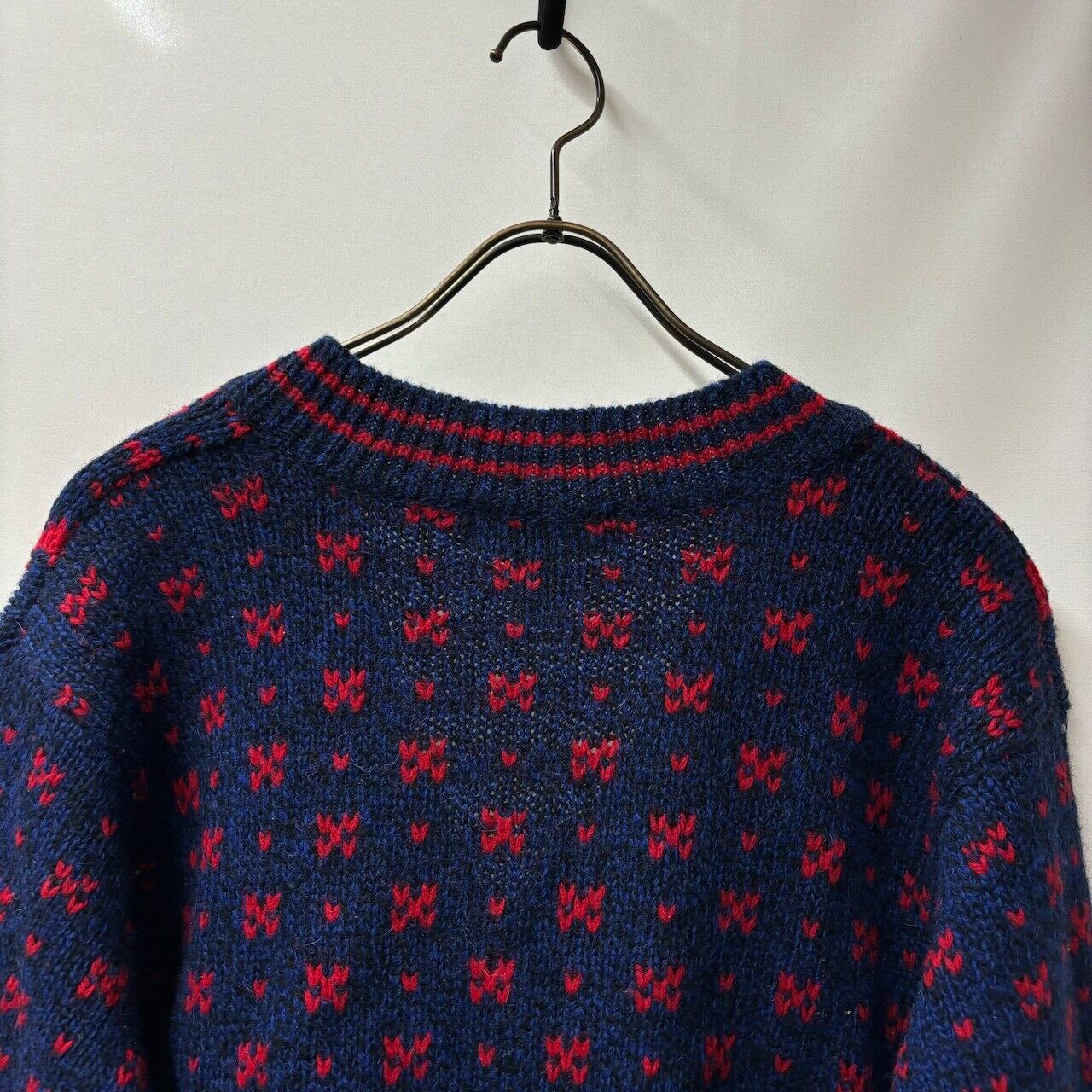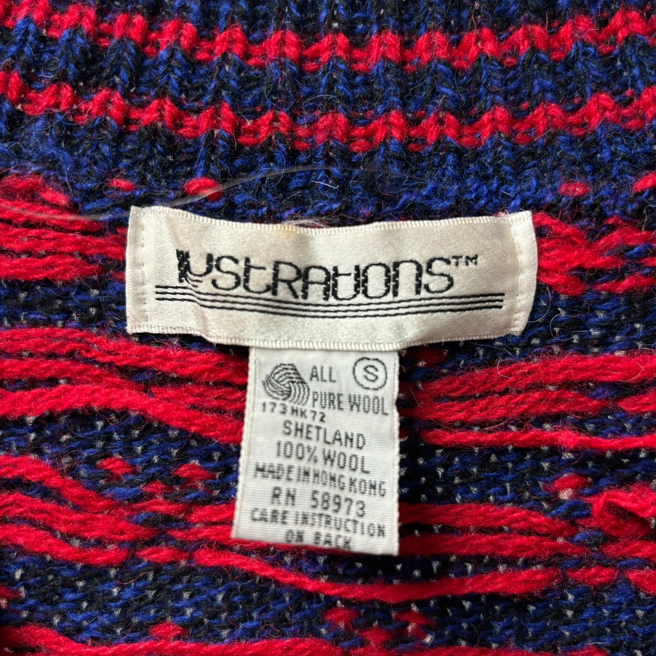 鮮やかな赤とネイビーの配色で、幾何学模様や雪柄のようなデザインが編み込まれたシェットランドウールニット。