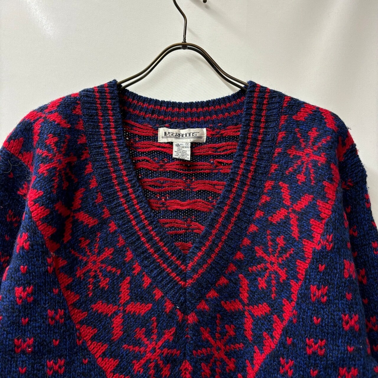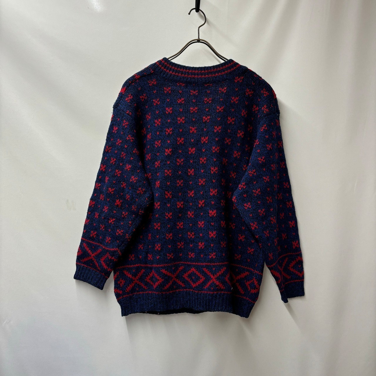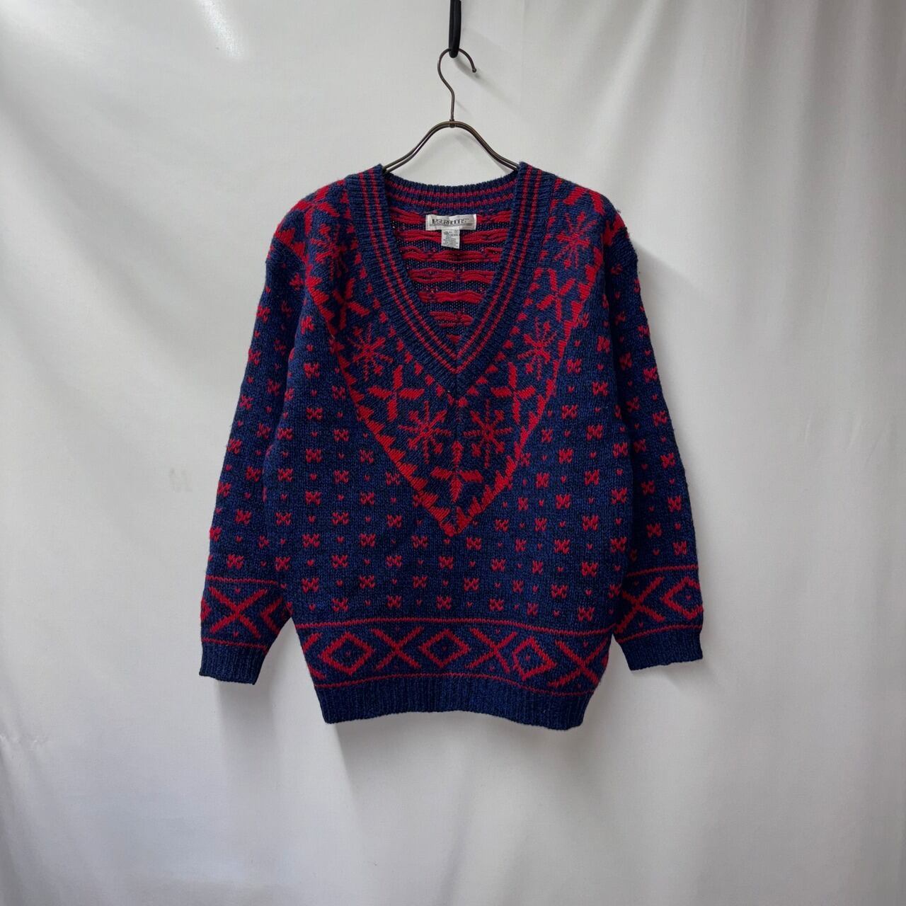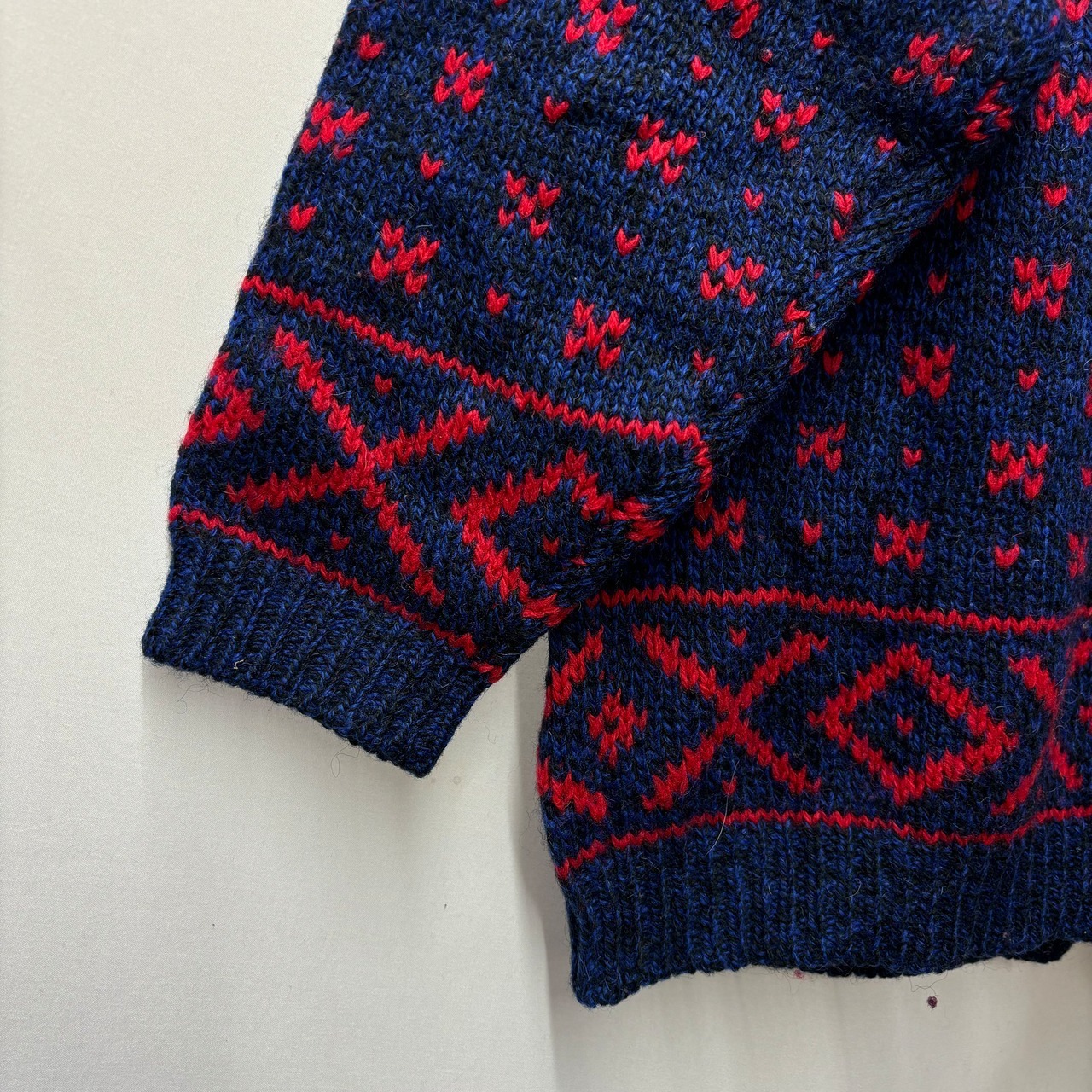 鮮やかな赤とネイビーの配色で、幾何学模様や雪柄のようなデザインが編み込まれたシェットランドウールニット。