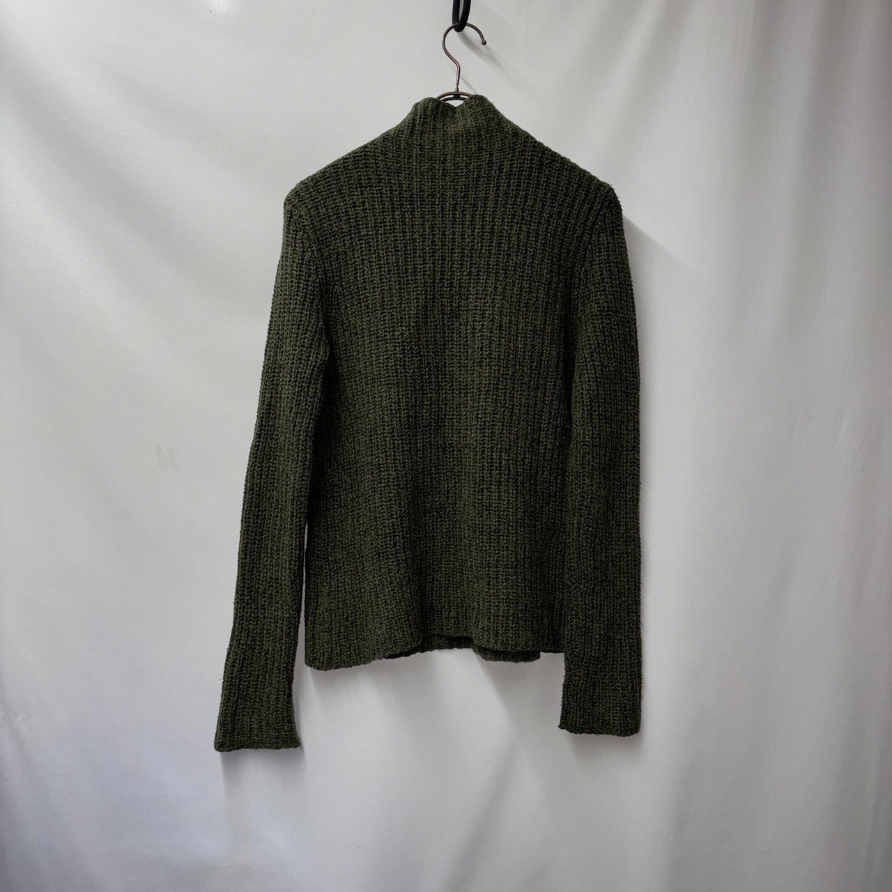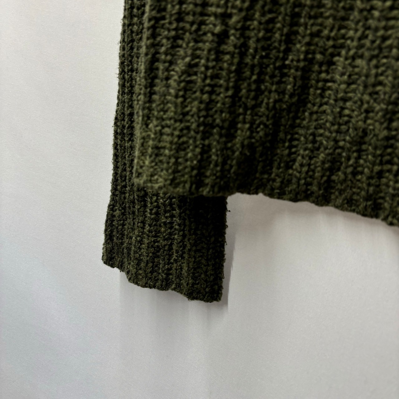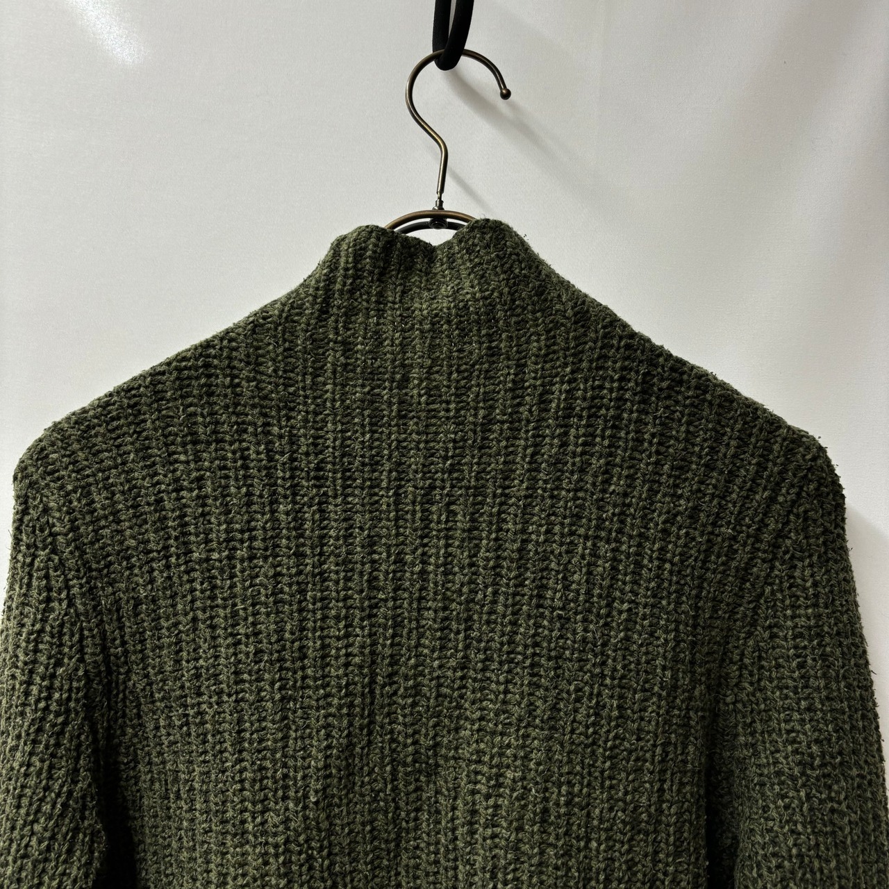 シンプルながら奥行きのある編地が特徴で、ミリタリーライクな深緑カラーが落ち着いた雰囲気を演出します。