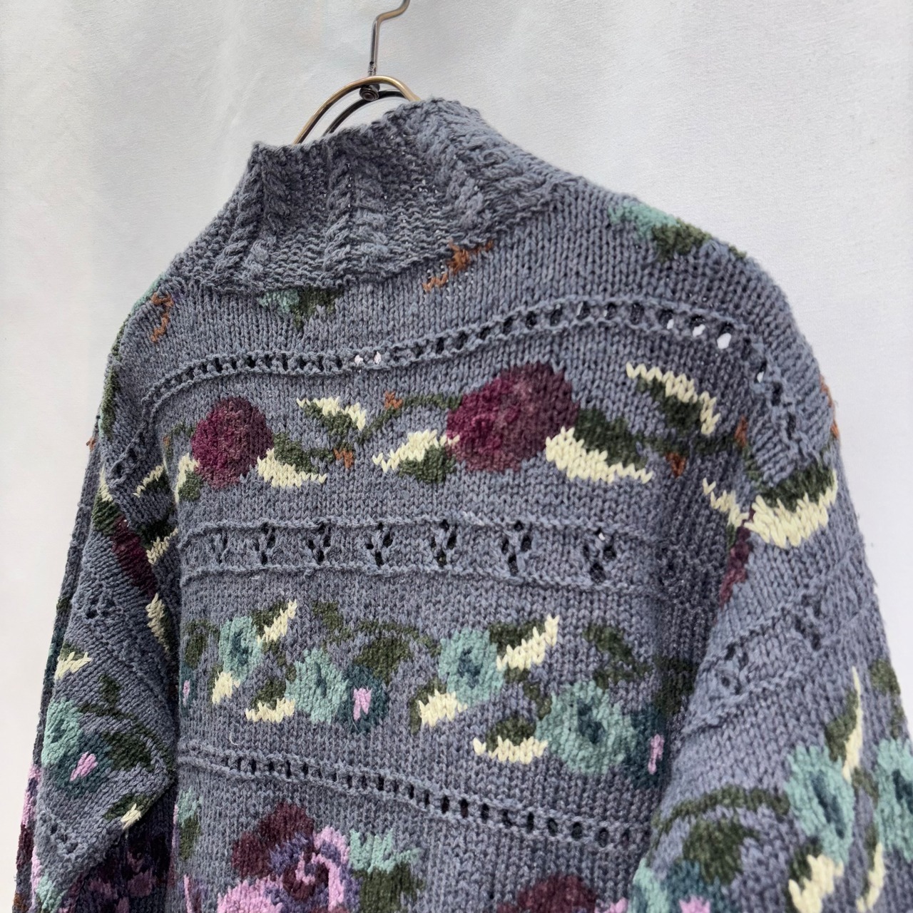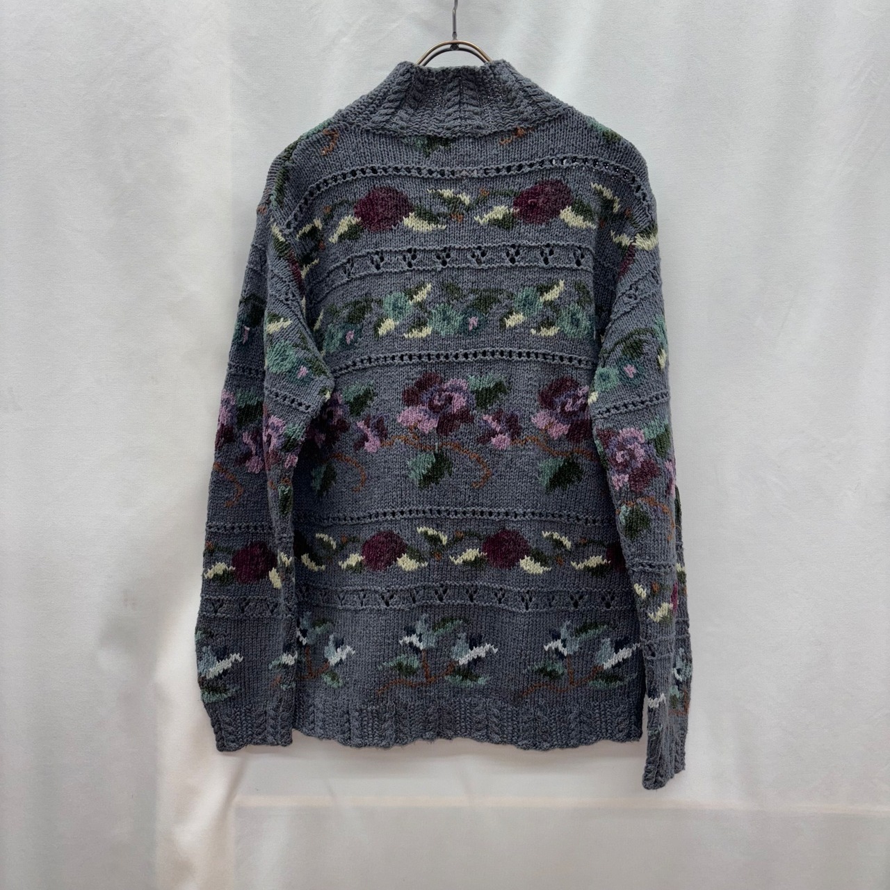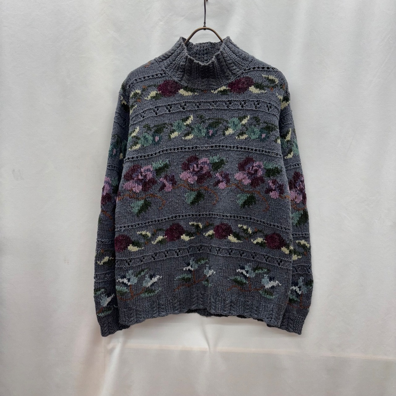 クラシカルなフラワーパターンが全面に編み込まれたハンドニットセーター。